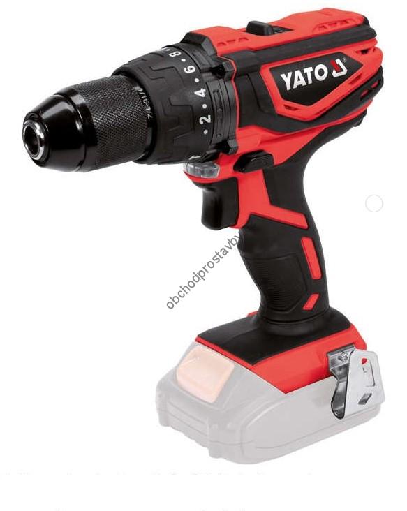 Profesionální akumulátorová vrtačka YATO s příklepem a dvourychlostní převodovkou, pohonné ústrojí je vyrobeno z velice trvanlivé a tvrdé oceli třídy HRC 53-56, ergonomický pogumovaný obal vrtačky je vyroben z polyamidu zesíleným skelnými vlákny. Do kovového rychloupínacího sklíčidla je možné upnout vrtáky až do průměru 13mm, vrtačkou lze vrtat do železa, betonu, cihly, plynosylikátových materiálů atp. Dále je vrtačka vybavena přisvícením pracovního prostoru pro práci při špatných světelných podmínkách a indikací stavu baterie.