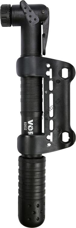 Lehká a pevná hustilka VOREL vyrobená z plastu s pístkem z hliníkové slitiny, opatřená univerzální koncovkou pro tenké i auto ventilky, součástí balení je i držák na kolo a dva nástavce pro nafukování míčů a matrací.