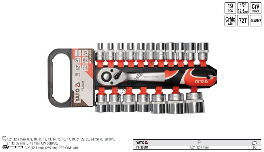 Sada nástrčných klíčů, ořechů, hlavic šestihran gola s ráčnou YATO 1/2" 19ks YT-38681.