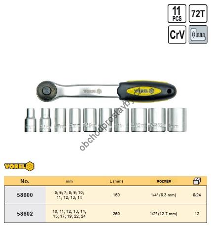 Kvalitní sada nástrčných klíčů, ořechů VOREL je precizně a přesně vyrobena z velice odolné chromvanadiové oceli, zahnutá ráčna je vybavena mechanismem se 72-mi zuby pro práci ve ztížených podmínkách a špatně dostupných místech.