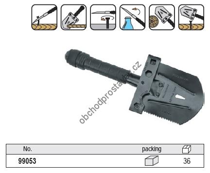 Ocelová, lehká, multifunkční lopatka, pilka, sekera, kladivo, klíč (10 a 13 mm),otvírák na láhve s kompaktními rozměry (28x10cm), snadno přenosná díky pevnému nylonovému obalu s poutkem k připevnění na opasek. V duté rukojeti naleznete hřebík, rybářský vlasec, háček na ryby, zápalky, žiletkový nůž a kompas. Lopatka a je nepostradatelným pomocníkem při kempování, výletech, turistice, rybaření, v aute, na zahradě atd.