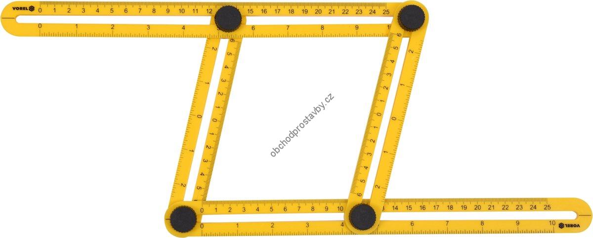 Plastový nastavitelný úhloměr k přenášení úhlů VOREL s vyraženou metrickou a coulovou stupnicí vyrobený z plastu, délka ramen je 250 a 120 mm, jednoduché, rychlé a přesné přenesení nastaveného úhlu se zajistí utažením 4 plastových matic. Úhelník je nepostradatelným pomocníkem hlavně při dokončování interiérů např. stolařů, tesařů, podlahářů, obkladačů atd.