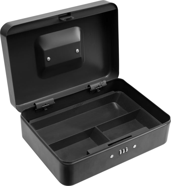 Černá přenosná příruční pokladna se zámkem na heslo VOREL, 250x180x90 mm, pořadač se 3-mi přihrádkami na mince TO-78628.