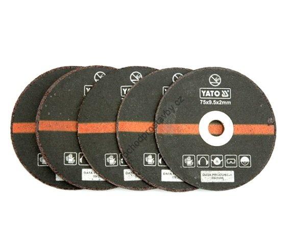 Řezné kotouče na kov pro pneumatické brusky YATO, cena je za balení a v balení je 5 ks řezných kotoučů o průměru 75 mm, tloušťka kotouče 2 mm a středovým otvorem 9,5 mm.