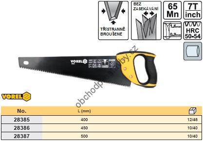 Klasická kvalitní ruční pilka s délkou 450 mm na dřevo VOREL s pogumovanou plastovou rukojetí z materiálu ABS a speciálně provedené třístranně broušené ostří s povlakem teflonu PTFE proti zasekávání pilky a řezání ve dvou směrech. Ostří je vyrobeno z manganové oceli a pracovní část je v třídě tvrdosti 50 - 54 HRC. Pila je určena k řezání dřevěných materiálů.
