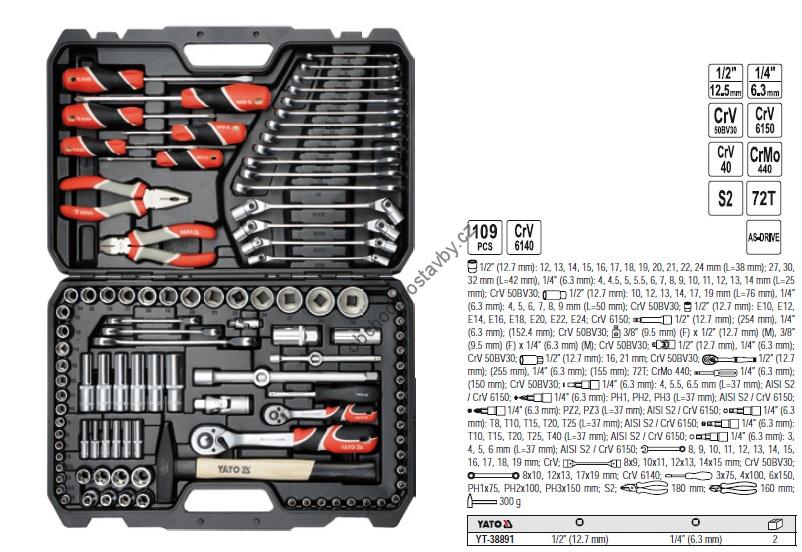 Sada nářadí, klíče, bity, ořechy, hlavice,šroubováky, kleště, gola sada YATO 1/2",1/4" velikost XXL 109 ks YT-38891.