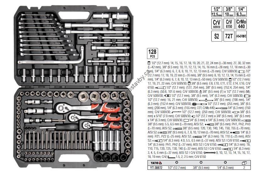 Sada nářadí, klíče, bity, ořechy, hlavice, gola sada YATO 1/2",3/8",1/4" velikost XL 128 ks YT-38872.