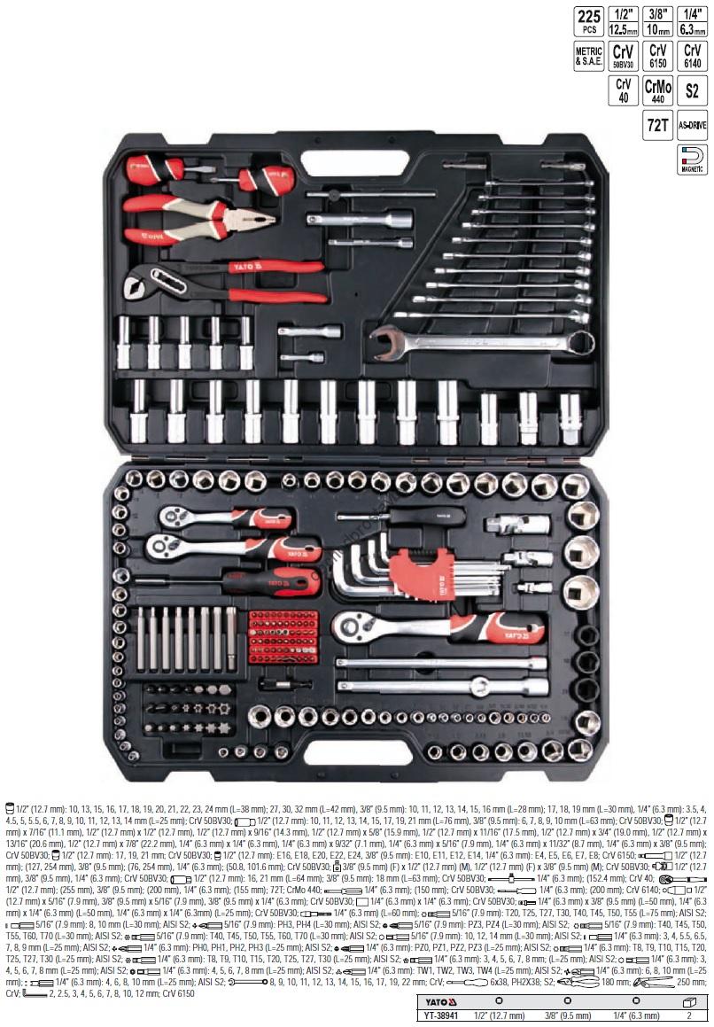 Sada nářadí, klíče, bity, ořechy, hlavice, šroubováky, kleště, gola sada YATO 1/2",3/8",1/4" velikost XXXL 225 ks YT-38941.