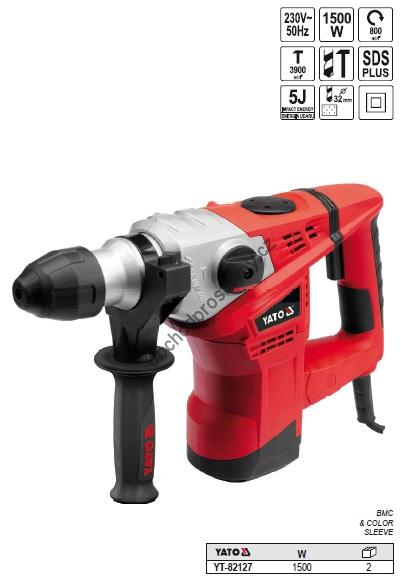 Vrtací kladivo YATO SDS + s příkonem 1500W a vysokou energii úderu 5J. Kovová zesílená konstrukce, která zajišťuje maximální mechanickou pevnost a rychlejší chlazení. Kladivo je klasické konstrukce s příčně uloženým motorem což zajišťuje dokonalé vyvážení a dlouhou životnost. Kladivo má spojku vyrobenou z vysokopevnostní oceli s ochranou proti přetížení a zajištění bezpečnosti obsluhy při zaseknutí vrtáku (např kovová výztuž železobetonu), dále má speciálně navržené otvory pro účinné chlazení a odvod prachu z motoru. Přístroj má prachotěsný vypínač s plynulou regulací otáček, pro pohodlnější práci je rukojeť vrtačky vybavena tlumičem vibrací s ergonomickou protiskluzovou úpravou. S vrtačkou lze vrtat s příklepem a sekat.