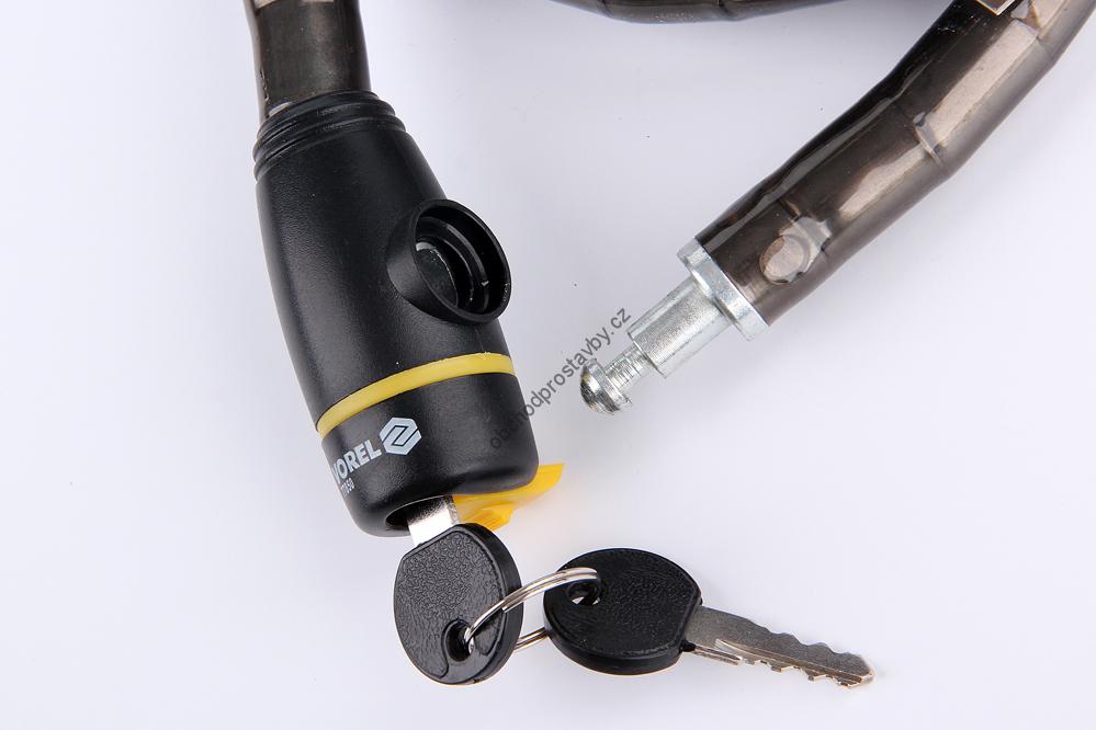 Kvalitní klíčový zámek na kolo VOREL, je vyroben z ocelového lanka vsazeného do pancéřových prstenů ke ztížení přestřihnutí běžným ručním nářadím. Povrchová úprava je provedena plastovou bužírkou jako ochrana proti podření kola. Délka zámku je 1 metr a celkový průměr lanka je 18 mm. Součástí balení jsou 2 klíče.